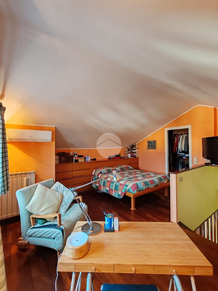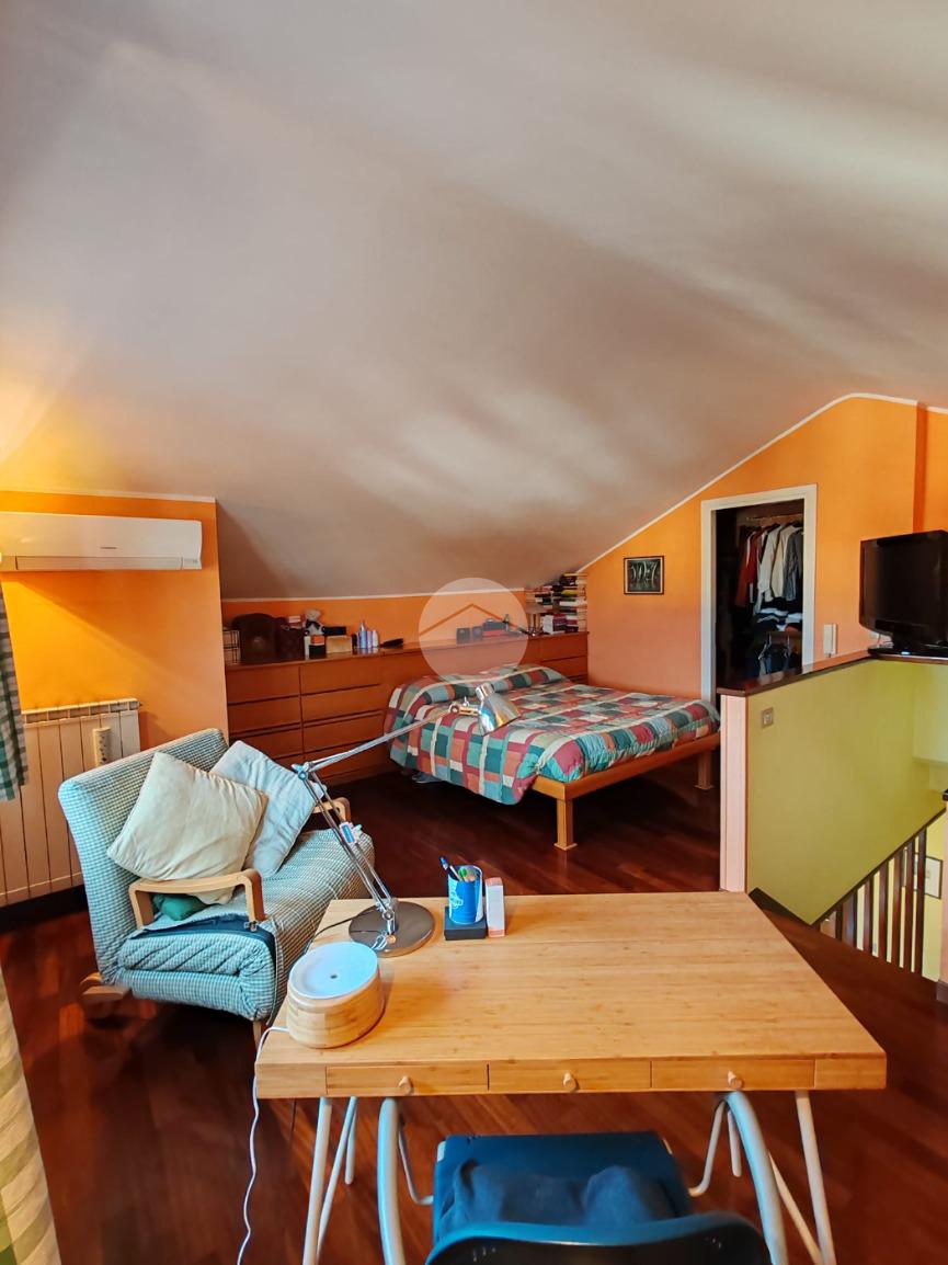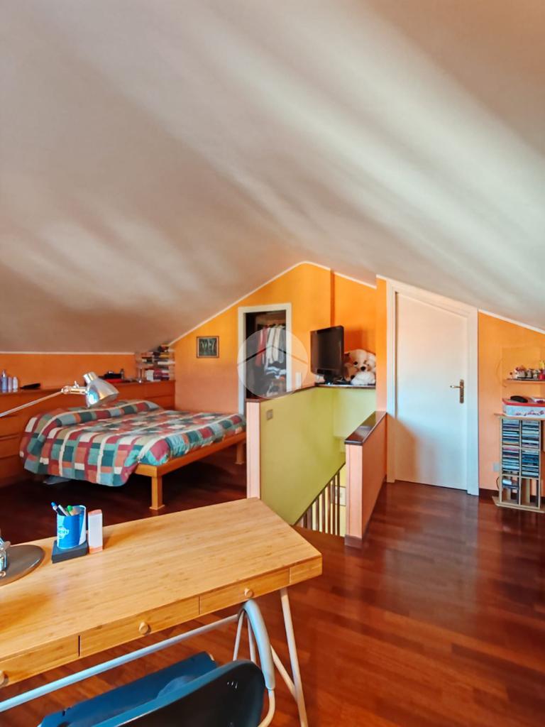 Per raggiungere il piano superiore percorriamo la scala interna che ci porta alla seconda camera da letto con annesso un secondo bagno, due comodi e ampi ripostigli ed una cabina armadio che ottimizza al meglio la disposizione della camera.