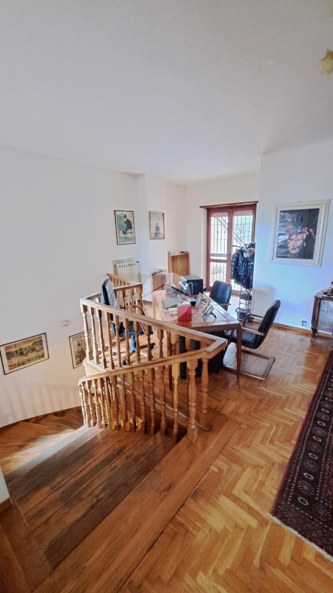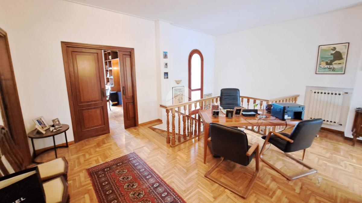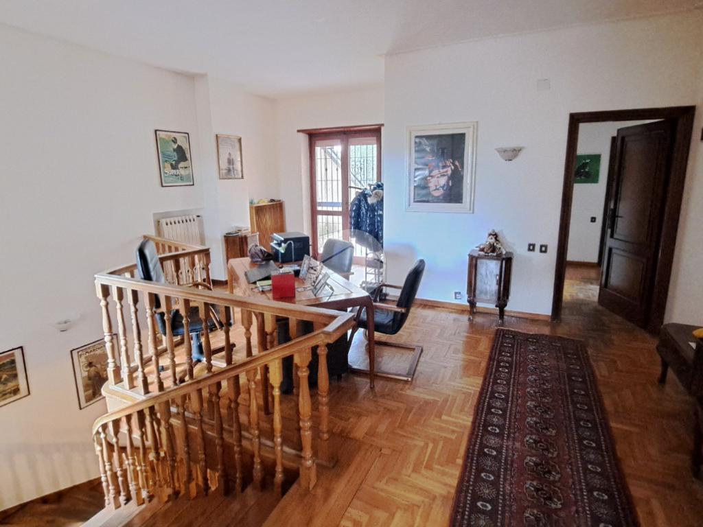 al piano primo possiamo accedere attraverso un elegante scala interna rifinita in legno massello dove troviamo un angolo open-space dedicato allo studio, un salone molto grande, 4 comode camere da letto, 2 bagni e il ripostiglio. Questo piano è interamente circondato da un ampia balconata che si ricollega anch'essa al giardino di sotto.
